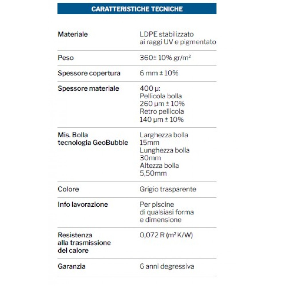 Realizzata con tecnologia GeoBubble™ di nuova generazione, integra materiali innovativi rinforzati con nanocompositi (tra cui grafene), che garantiscono una struttura più resistente, flessibile e duratura rispetto alle tradizionali coperture isotermiche.
