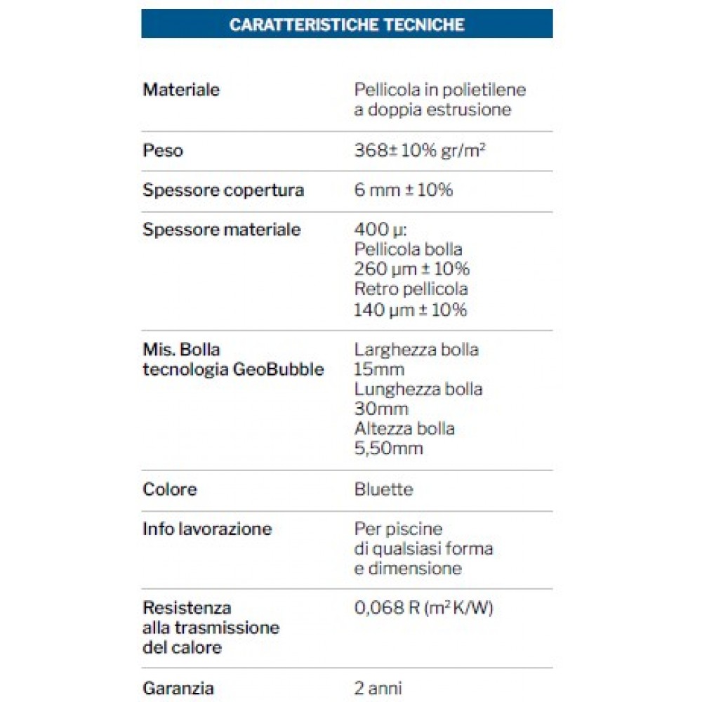 La copertura SunGlo utilizza la tecnologia GeoBubble™, caratterizzata da bolle d’aria con dimensioni 15 × 30 mm progettate per garantire maggiore isolamento termico e resistenza rispetto alle tradizionali coperture a bolle. Questa struttura innovativa riduce i punti di stress del materiale e migliora la durata complessiva della copertura.