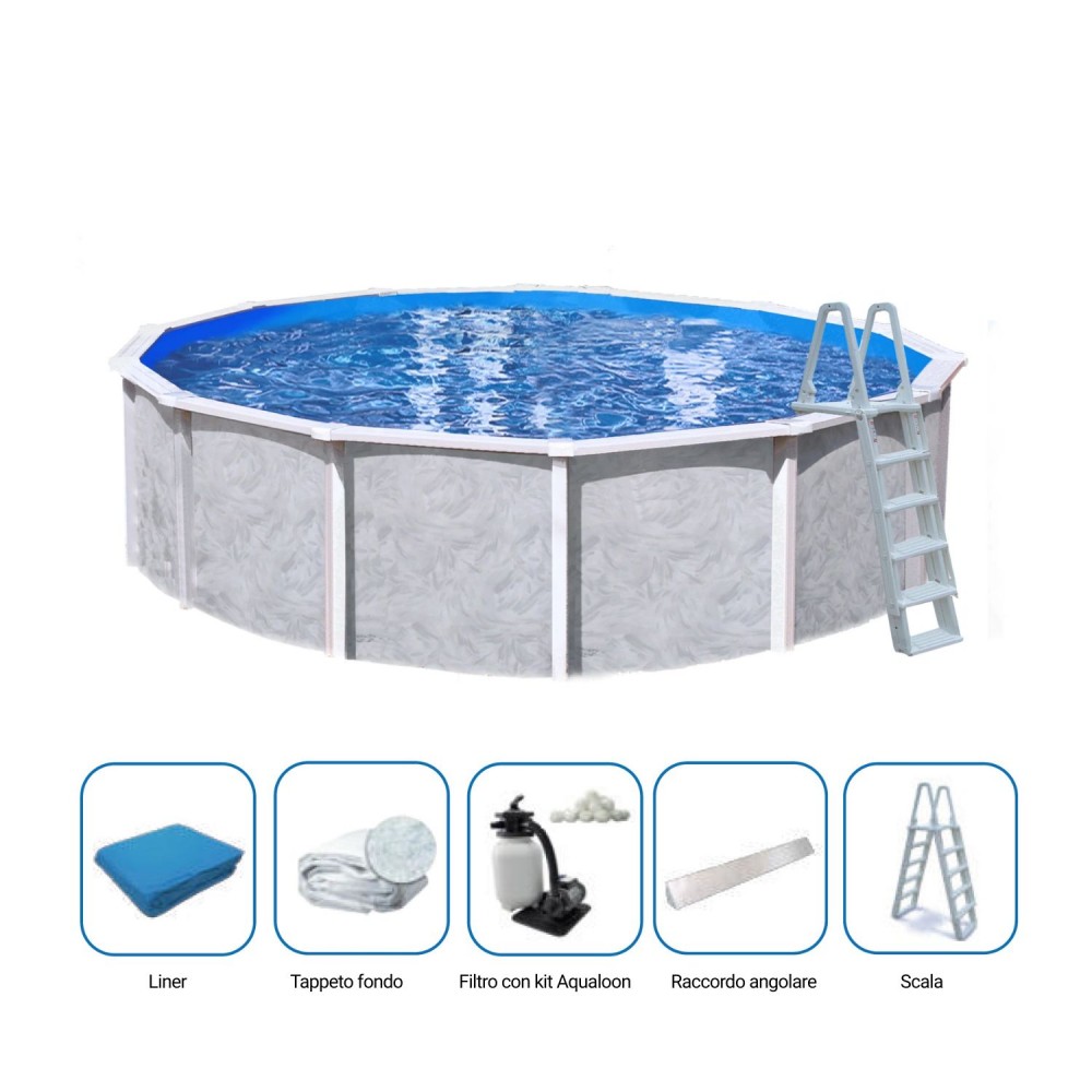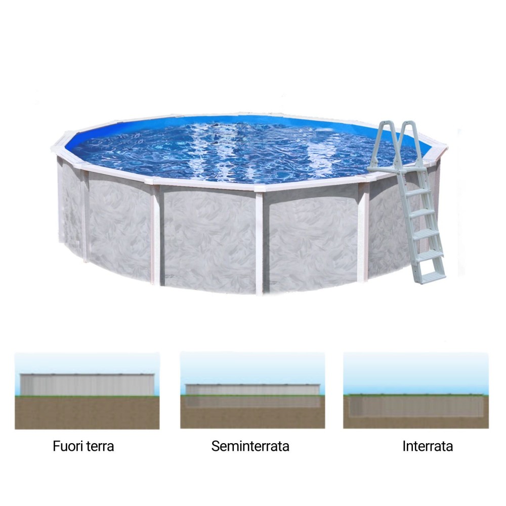 Piscine autoportanti in acciaio zincato di varie misure di finitura bianca. Tutte le piscine sono comprese di accessori per il corretto funzionamento. Vi invitiamo a visitare il Tab specifiche per avere maggiori informazioni sulle piscine di questa pagina. Le piscine sono spedite su Pallet completamente smontate. Le misure indicato sottostanti si riferiscono allo specchio d'acqua della piscina.